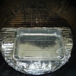 Dies hat den Vorteil, dass einerseits durch die Aluminiumfolie ein konstanter Luftzug, welcher von den Kohlen über das Grillgut streift, gewährleistet und die im Anschluss folgende Reinigung des Grills erheblich erleichtert wird. Die Tropfschale, welche mit Flüssigkeit (Wasser, Bier, Wein …) befüllt wird, hat einerseits die logische Aufgabe die Flüssigkeiten, welche aus dem Grillgüt strömen, aufzufangen und andererseits dient die Flüssigkeit als Wärmespeicher, um bei öfteren Öffnen des Deckels die Temperatur im Grill nicht allzusehr abfallen zu lassen.