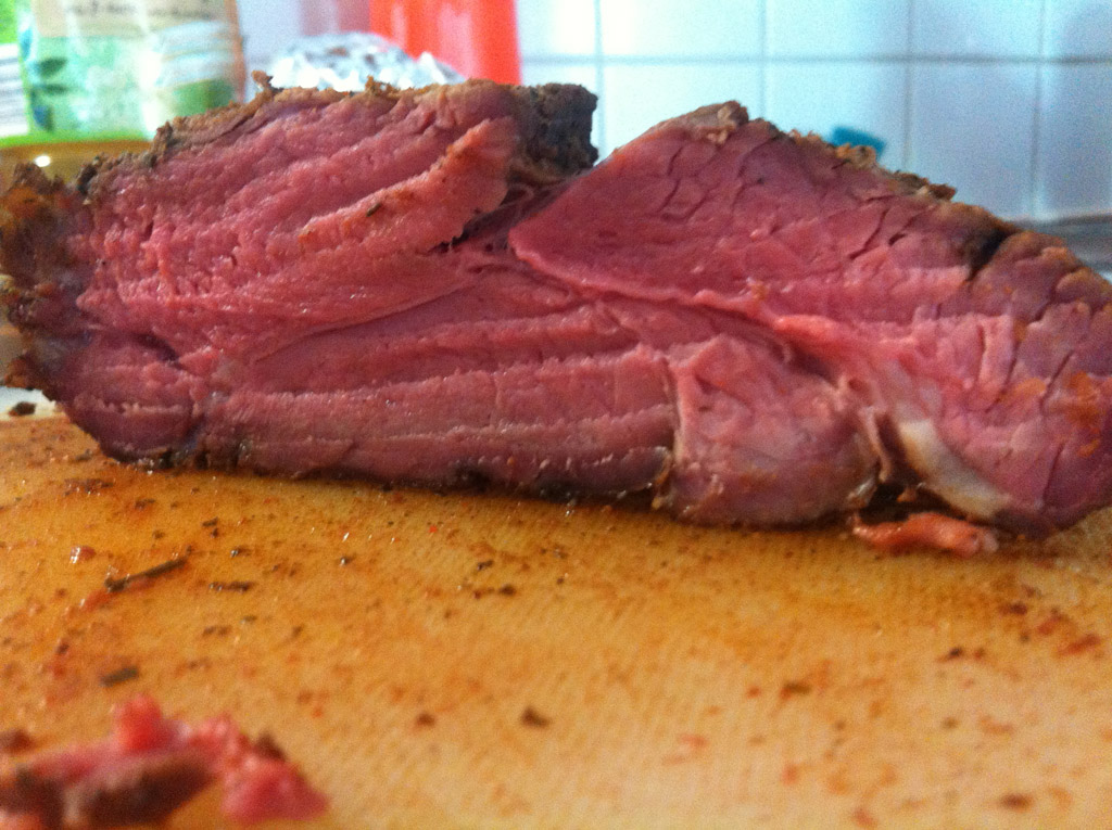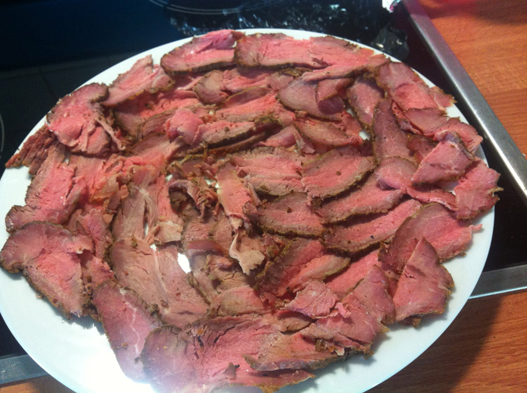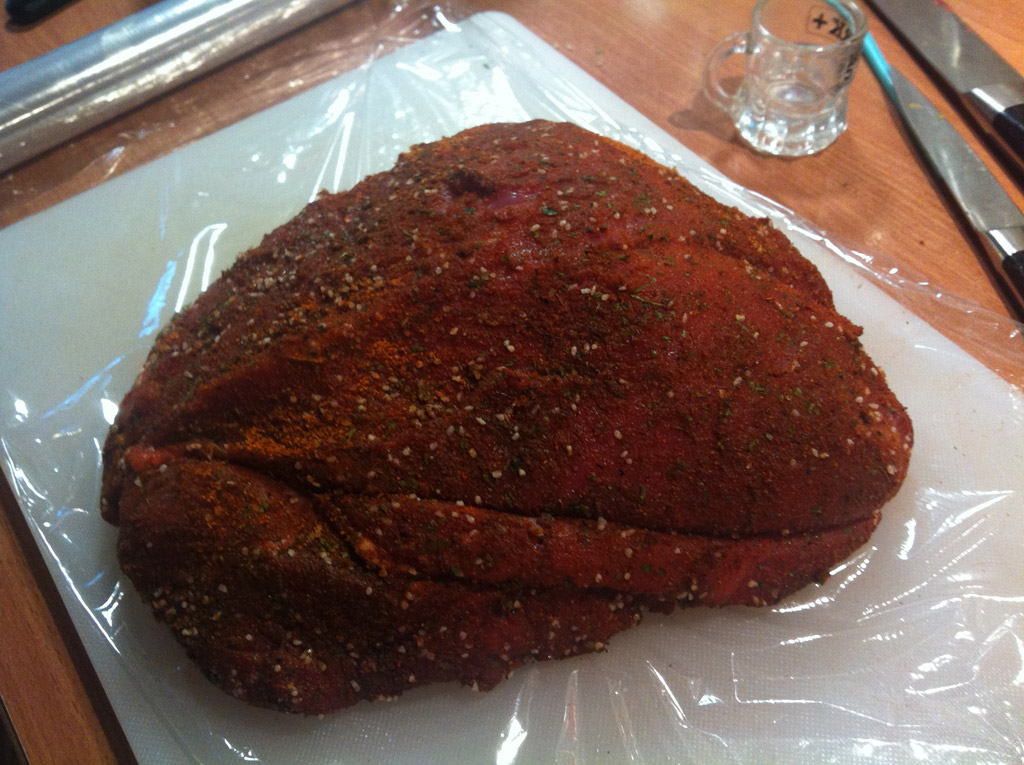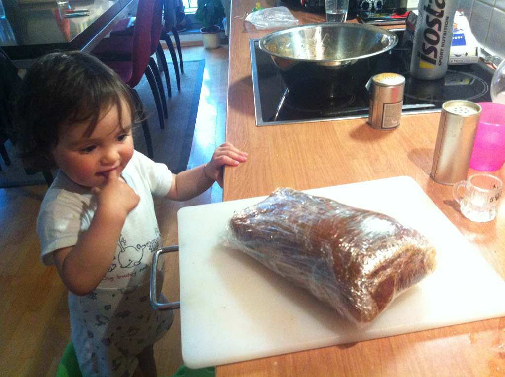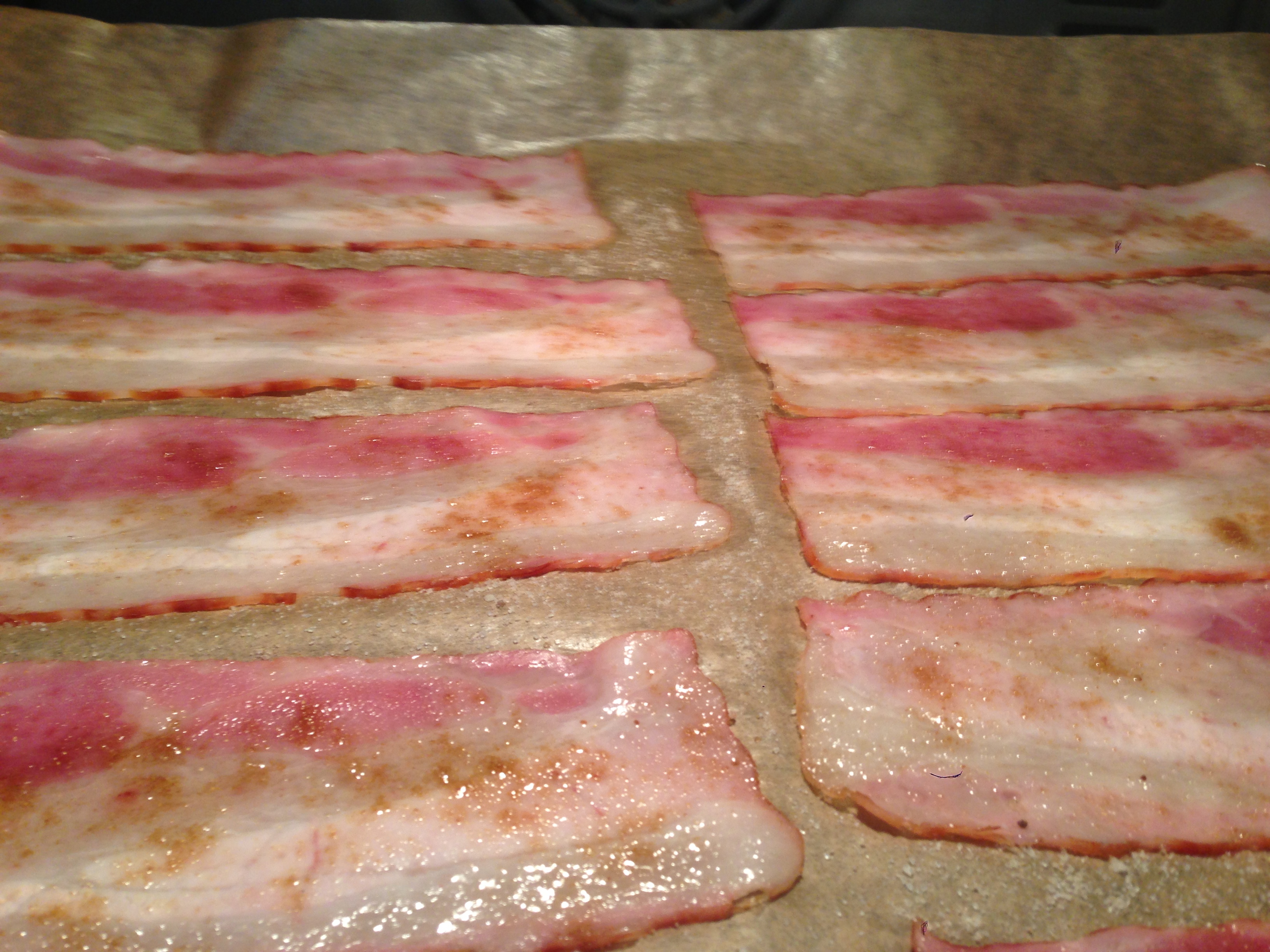 - Den guten Aiblinger Speck im Backrohr mit Koriandersamen und braunem Zucker (im Mörser zerstösselt) geil werden lassen. Gleich vor Geilheit auffressen, wird nicht gebraucht, jedoch: Ausgelaufenes Fett sammeln (wenn man nicht noch welches übrig hat)!